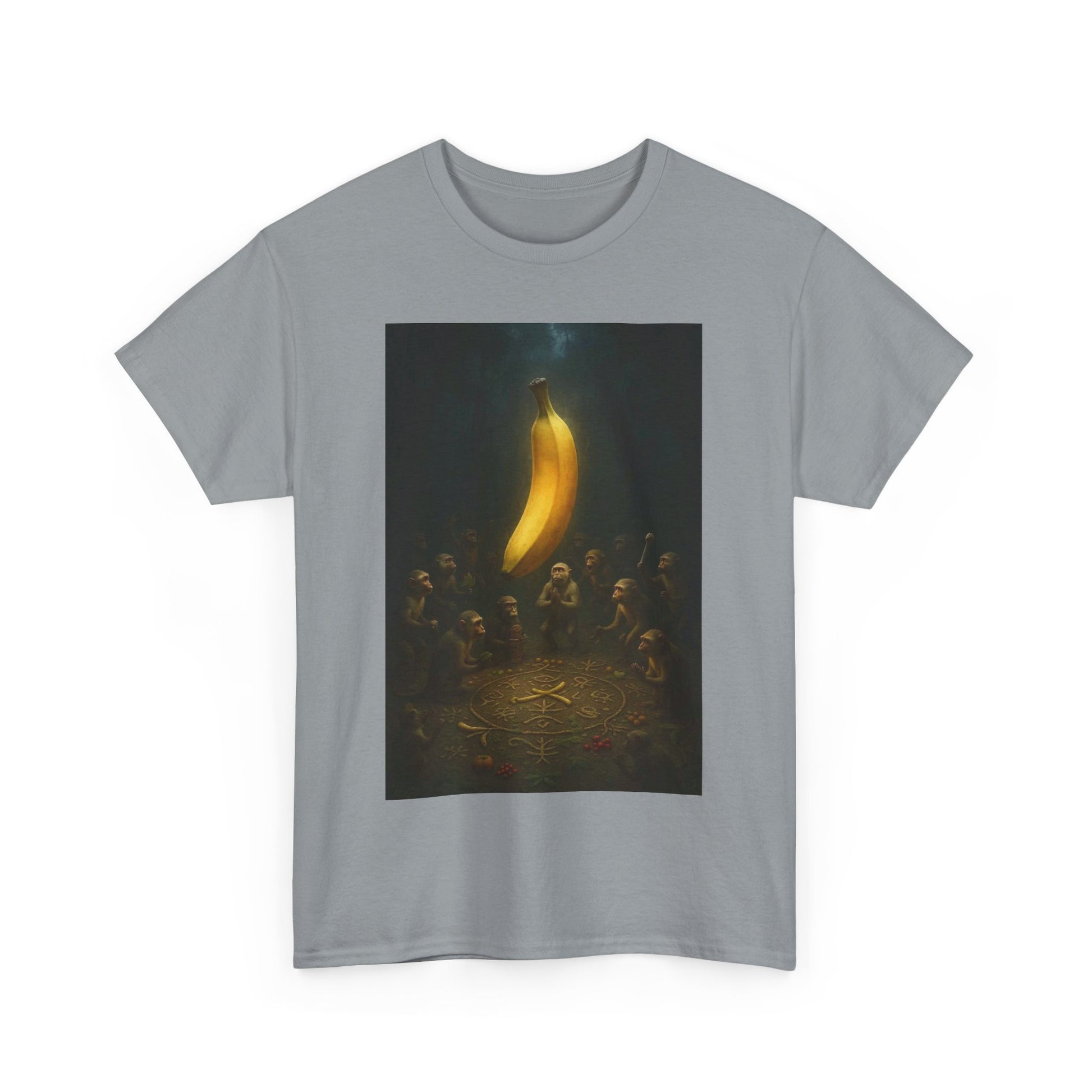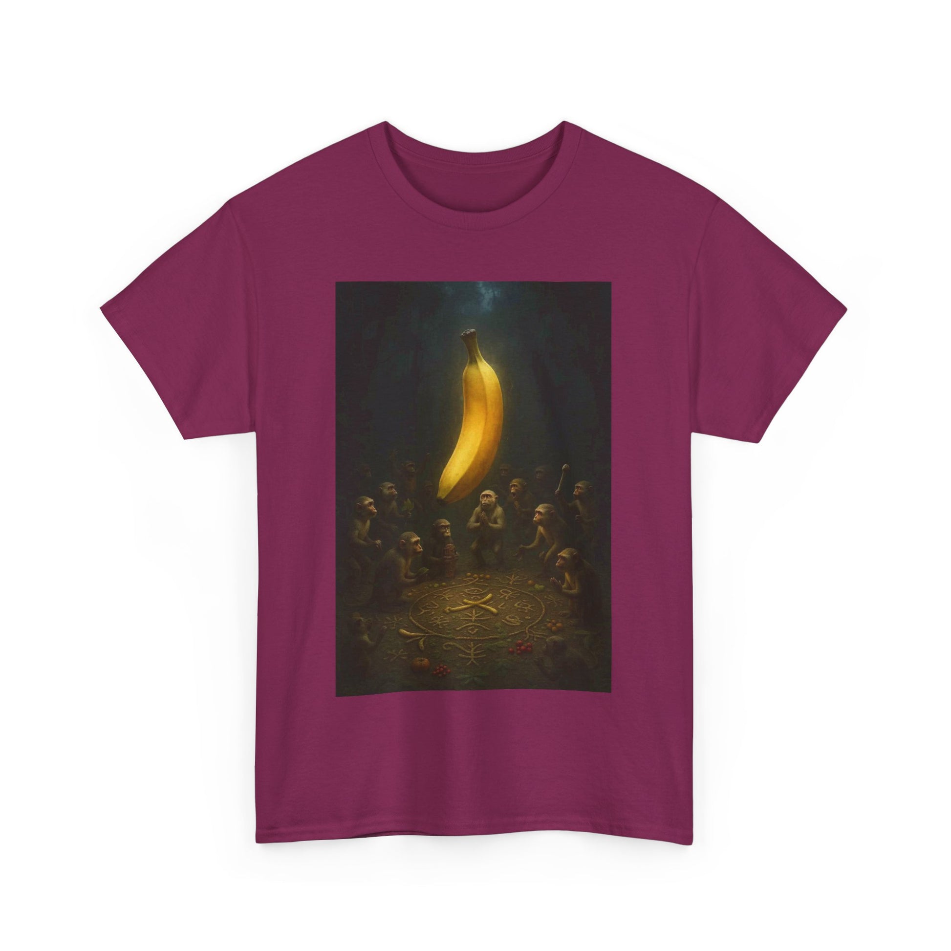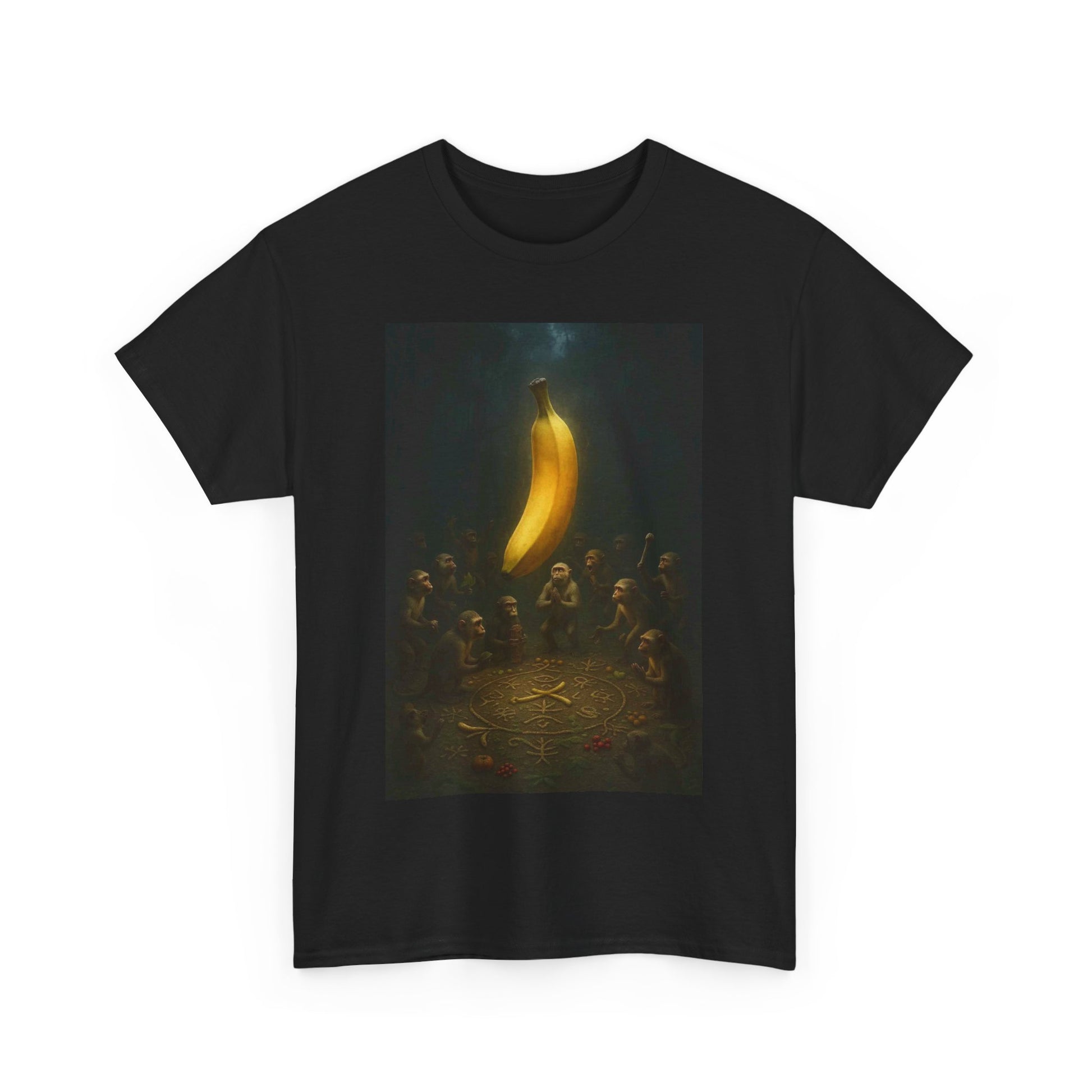 In the beginning, there was peel. They gathered not for food, but for enlightenment. This shirt commemorates the sacred moment when fruit became faith — a banana was lifted, and the primates ascended. Ideal for the devoutly unhinged, the spiritually malnourished, and anyone who’s ever questioned the produce section a little too hard.