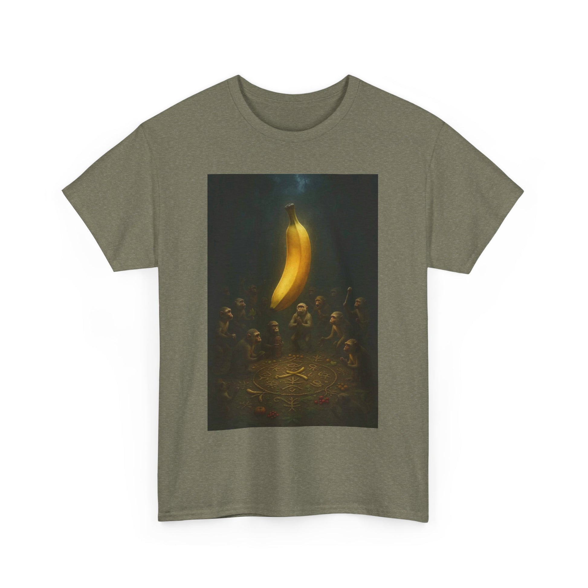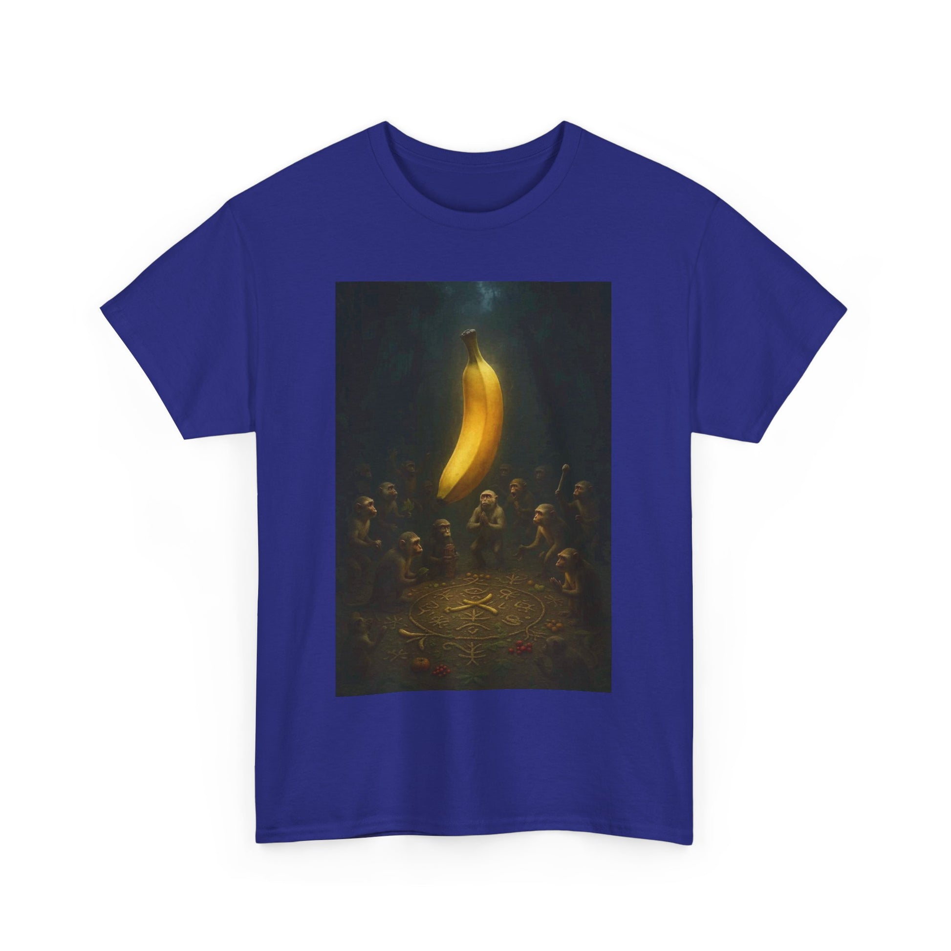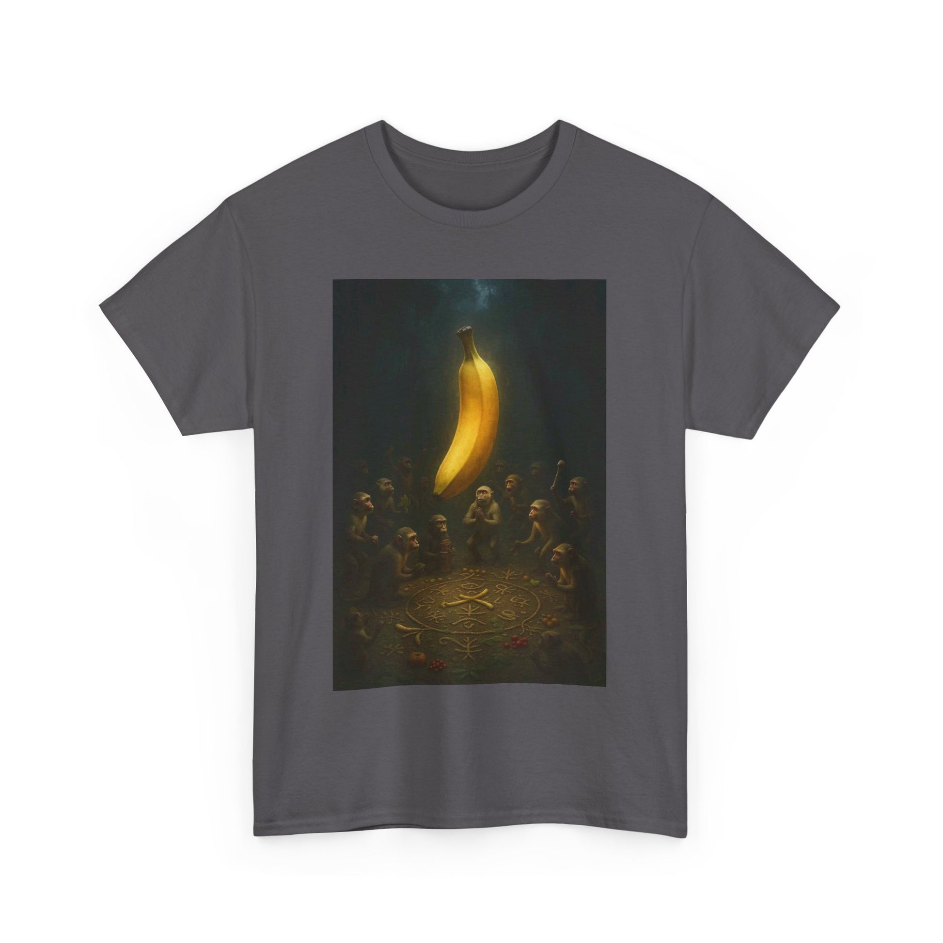 In the beginning, there was peel. They gathered not for food, but for enlightenment. This shirt commemorates the sacred moment when fruit became faith — a banana was lifted, and the primates ascended. Ideal for the devoutly unhinged, the spiritually malnourished, and anyone who’s ever questioned the produce section a little too hard.